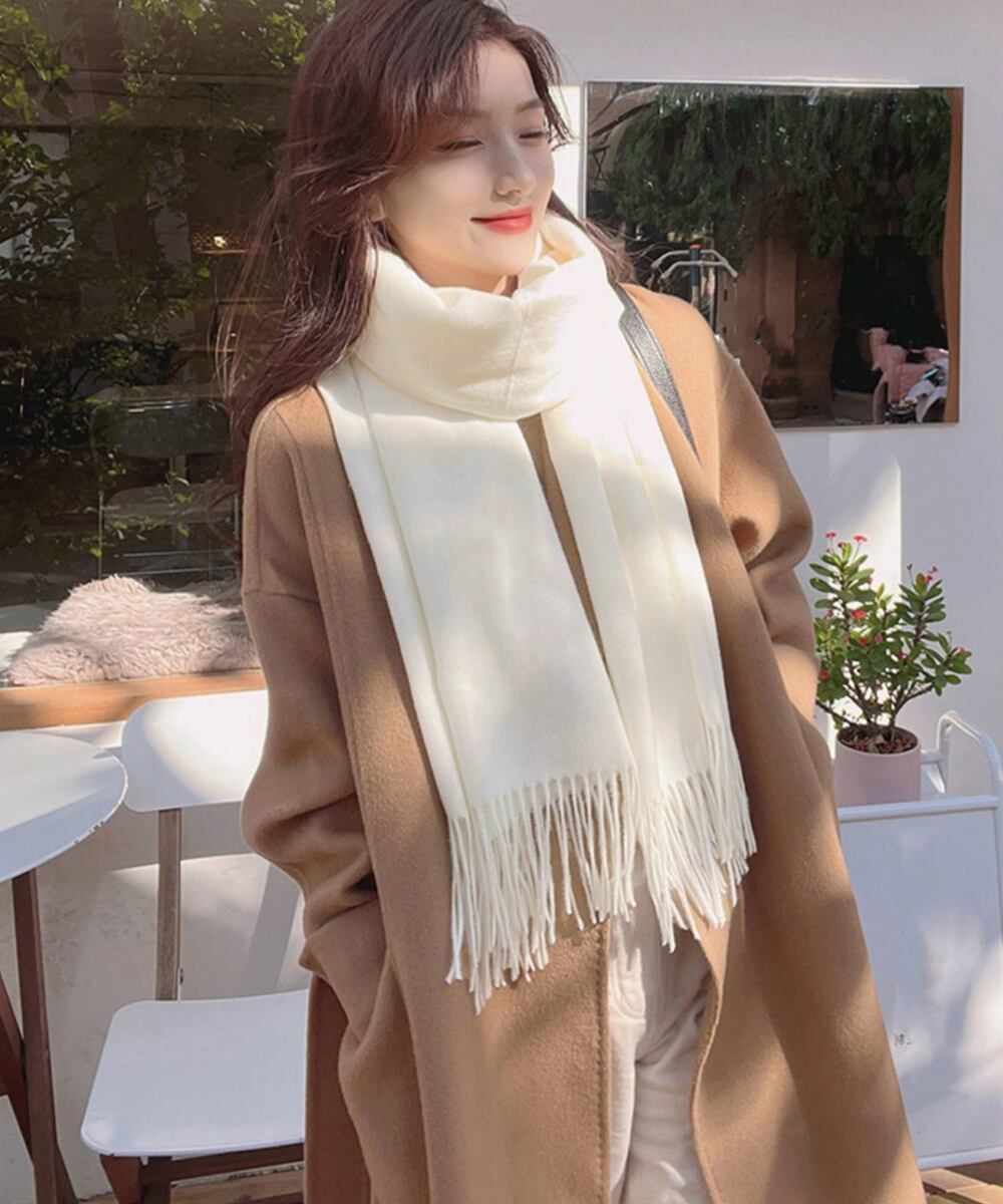 柔らかい上質なカシミヤ風生地を贅沢に使用、シンプルでスタイリッシュなフリンジ付き無地大判マフラ!