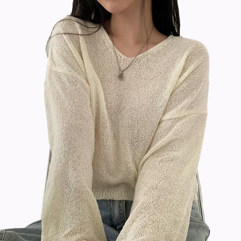 メッシュVネックニット 透かし編み 長袖 カギ編み 透け感 抜け感 サマーニット