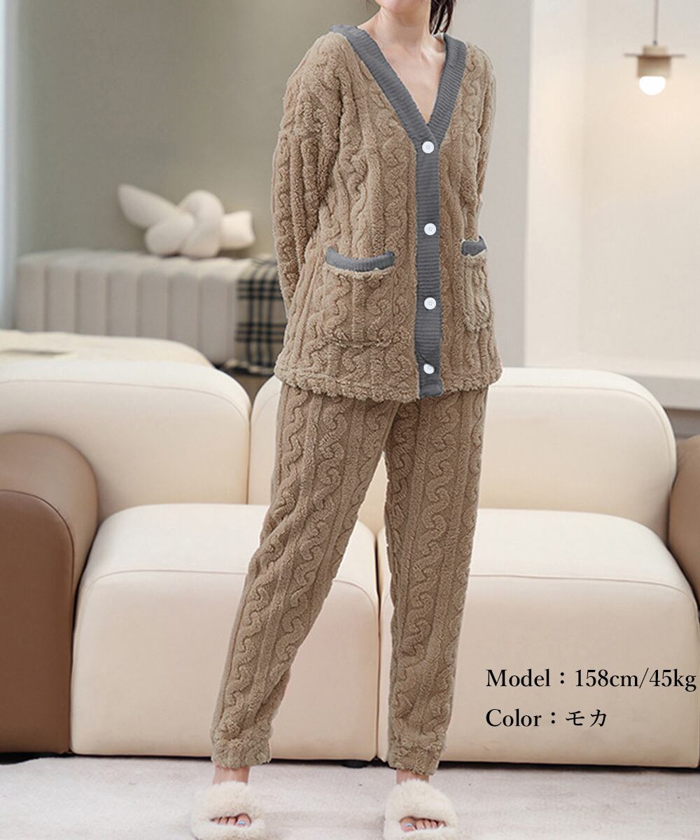 大人可愛い もこもこ部屋着 ケーブル柄 ルームウェアセットアップ 秋冬 ふわふわナイトウェア 軽く暖かい 厚手長袖寝巻き