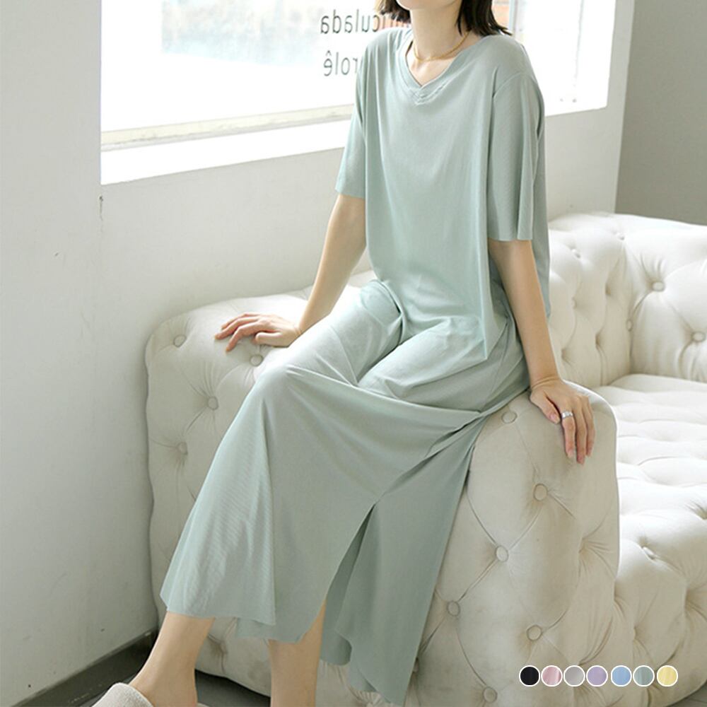 半袖ルームウェア 体型カバー レディース 夏パジャマ 薄手tシャツワンピ 快適部屋着 細めリブ スリット入り 肌触りいい